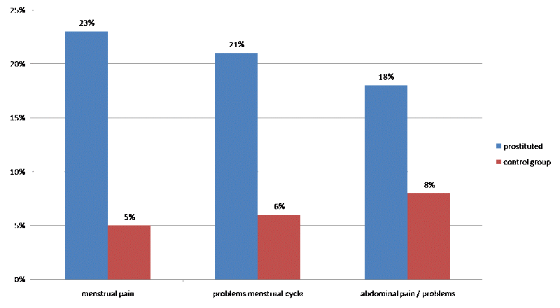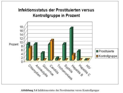 エイズ防止団体は、性感染症の問題になると、被買春女性のあいだでは、そうでない女性と比べて、HIVの有病率が高いことは示されていないとしばしば強調します。研究はこれが正しいことを証明していますが、この主張は、リューベック大学によって行われた調査での、売春女性と非売春女性との以下の比較表からわかるように、他の性感染症にはあてはまりません(以下のグラフ参照。左から、クラミジア、細菌性膣炎、淋病、カンジタ、トリコモナス、梅毒、B型肝炎、C型肝炎、HIV)。