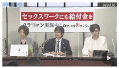 The Japanese government initially excluded women in the sex industry from a subsidy scheme for workers in the pandemic,[16] but efforts by abolitionist feminists, such a letter to the minister signed by academics Onozawa Akane, Kim Puja, and Nakasatomi Hiroshi, saw this decision overturned. This revised decision was different, however, from the government’s continuing exclusion of sex businesses from an industry-support financial subsidy scheme.[17] This decision was justified on the grounds that the sex industry was an ‘enterprise of harm’, even if partly legalised Japan. In response, an escort agency owner, supported by one of Japan’s sex industry associations, launched a civil suit against the government, which is still in the country’s courts.[18] As in the photo below, the industry is represented by left-leaning lawyers, including a female lawyer with a progressive media profile.[19] The case is being brought on the rhetorical grounds of ‘assistance for sex work’ (as in the banner behind the lawyers). In other words, sex industry entrepreneurs used the language of the pro-prostitution ‘sex worker rights’ movement in the pandemic to lobby for government subsidies. In turn, Japan’s main sex work group supported them. Lawyers representing the sex industry staged a press conference in September 2020 to announce their suit against the government that was uncritically reported on by Japan’s public broadcaster NHK.