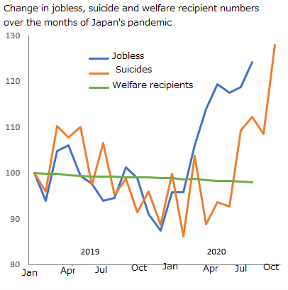Overall, Japan in the year of Corona brought to the society’s surface the sex industry’s largescale activities in a country where women’s status is low, and their share of national income small. While there are overseas trafficking victims in Japan’s sex industry, the industry mostly trades young local women, both in systems of prostitution and pornography. The nature of the pandemic, which damaged hospitality and tourism industries disproportionately employing high numbers of young women, meant that a larger population of Japanese women became newly vulnerable to entry into the sex industry. Concurrent downturn in brothel and similar businesses of the sex industry, due to customer fear of infection and social constraints on after-work entertaining, is likely to have increased competition for revenue. This might mean women in the industry are having to acquiesce to unreasonable and violent demands from pimps and customers in exchange for small payment. Parts of Japan’s sex industry even before the pandemic were trading women at very low rates, and the pandemic is likely to have pushed the poverty and exploitation of these victims further. Japan’s social welfare safety net is very weak, and, as the following graph indicates, welfare recipients declined over the months of the pandemic while jobless and suicides rose. This overall trend impacted upon the young, female, impoverished population of Japan’s sex industry, and limited their options for survival in the pandemic.