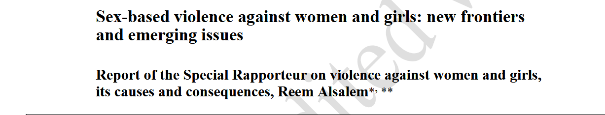 「女性に対する暴力は、生物学的性別(biological sex)という物質的な現実に根ざしており、多くの場合、他の諸側面と交差することで、暴力に対する脆弱性を増大させている」と、「女性に対する暴力、その原因および結果に関する特別報告者」であるリーム・アルサレムは、人権理事会への報告書で述べている。